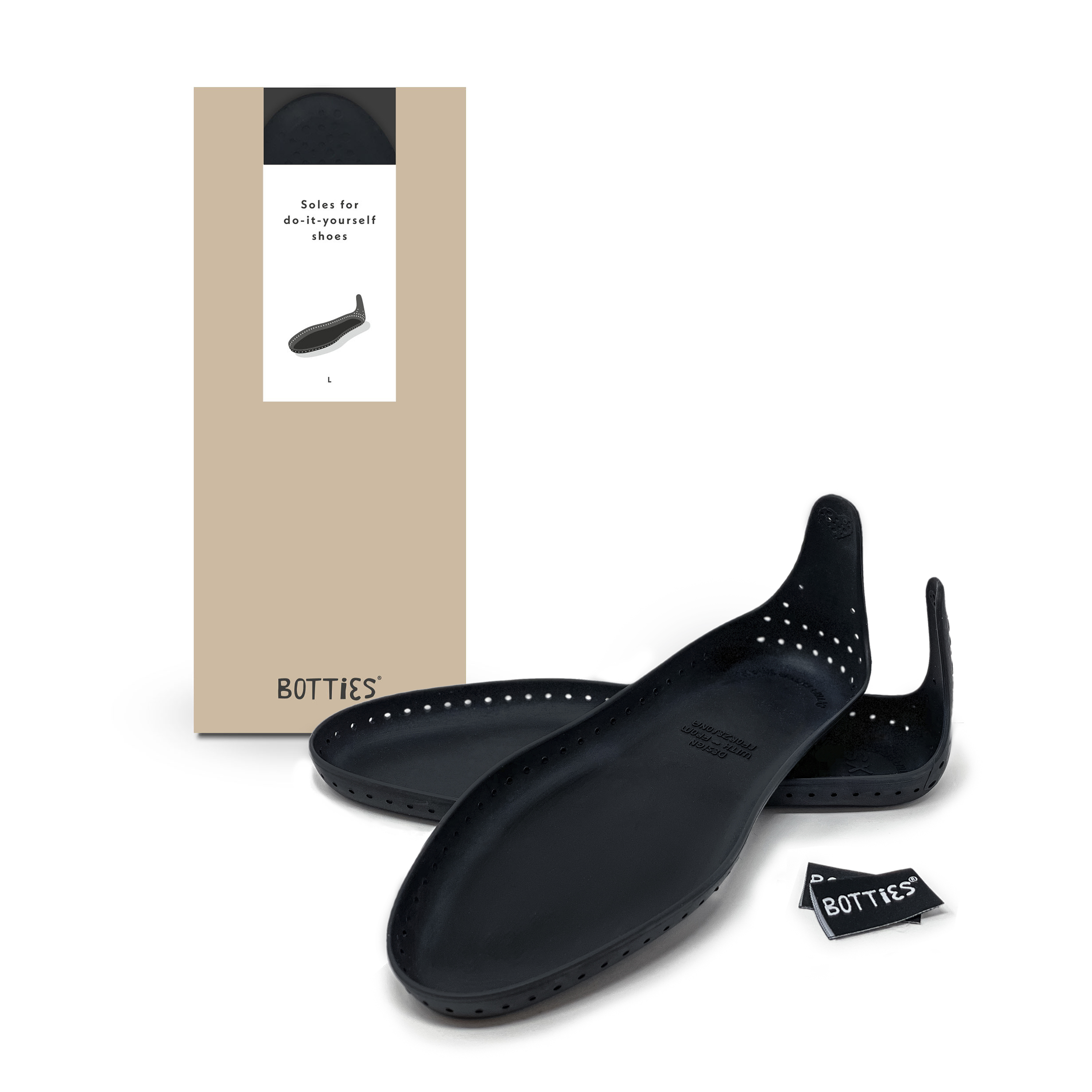 Botties kits come in a range of shoe sizes and include the Botties soles and matching insoles.