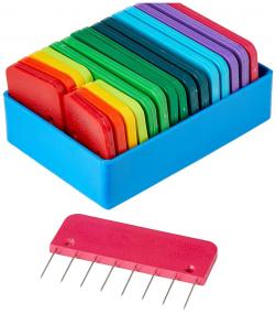 An innovation that makes blocking super quick and convenient, these handy blocking tools are available in colourful version. Having more than one pin tip, our knit blockers make blocking wide-width projects easier. Anchor holes in each blocker allow you to attach a string along the longer side, which can be pulled to maintain even tension. Made of durable plastic, with rust-resistant pins, our knit blockers help you to expertly finish your projects. Packaging: Pack of 20 Knit Blockers (12 Knit blockers having 8 pins & 8 Knit Blockers having 4 pins)
